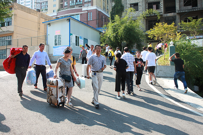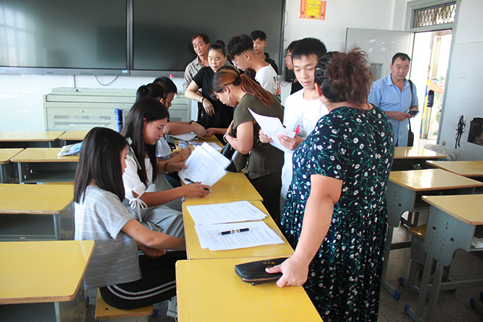七点整,各岗位人员全部就位开展工作。操场上家长与新生在展牌前查找所在班级、志愿服务者亲自为他们搬运物品;咨询处,接待人员耐心地为家长解答各种问题;教室里,班主任正在为新生办理入学注册手续、发放校园卡,并由高年级学生带领安排住宿……