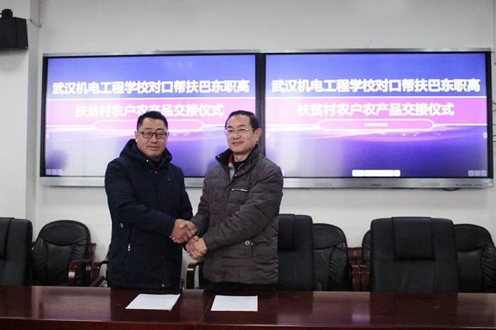 1月4日,武汉机电工程学校援助巴东职高扶贫村采购农产品交付仪式在巴东职高举行,该校校长龙善寰与巴东职高校长廖正贵共同出席交付仪式。